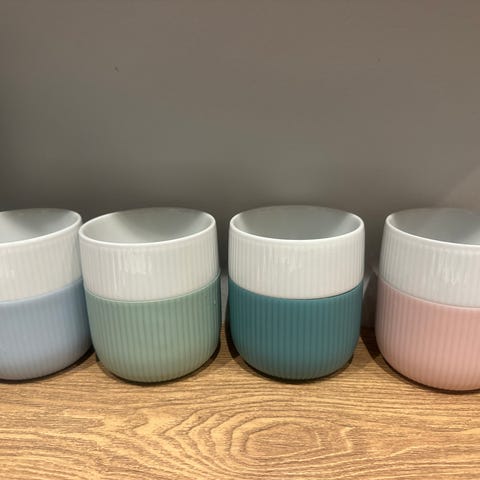 Royal Copenhagen contrast kopper i forskellige farver. En lysegrå, en mørkegrå, en pink og en lilla. Fin stand. Sælges samlet til 200 kr.