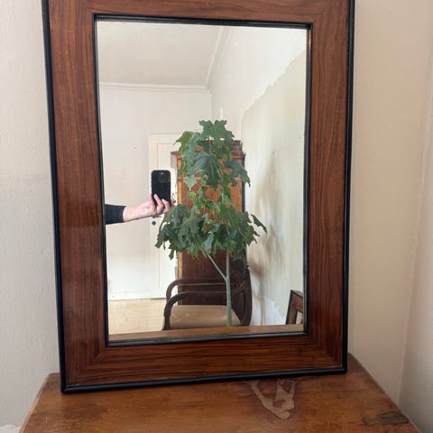 Smukt antik spejl fra 1800 tallet i fineret mahogni. Små kosmetiske brugsspor & et enkelt sted hvor fineren er faldet af.