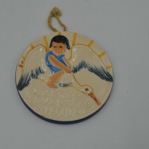 SOLGT : PLATTE ( 1911 ) MED, : DRENG PÅ RYGGEN AF EN STORK.