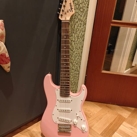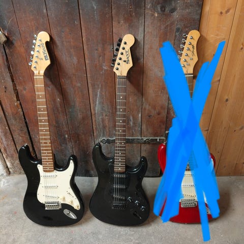 Squier Strat elektrisk guitar sort og spansk guitar brun.