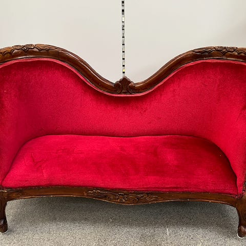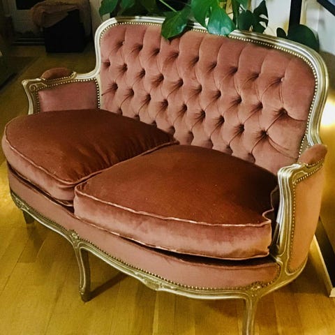 Mini retro sofa og stol i gult og grønt rokokko mønster og gule frynser.