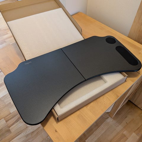 TESLA bagsæde armlæn med integrerede kopholdere og opbevaringsrum. Armlænet har en overflade i beige materiale og en sort bund med to kopholdere. Udstyret med en strop til fastgørelse. Designet til at give komfort og praktisk opbevaring i bilen.