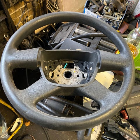 Skoda multifunktionsrat i sort læder med integrerede kontrolknapper til telefon og lydstyrke. Passer til biler med airbag og multifunktionsstyring.