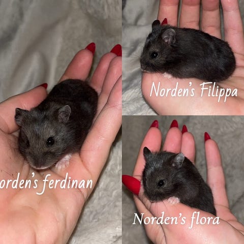 Ungerne er født og opvokset i rolige omgivelser i vores opdræt og de er dermed håndteret siden de var helt små og de er derfor 100% håndtamme og vant til daglig håndtering. Ungerne er efter søde og meget rolige forældre og man sikre sig derfor en hamster med et rigtig godt og roligt temperament. Der er 4 hunner & 2 hanner, en enkelt i grå, resten er sorte m hvid mave/ bryst eller stribe.