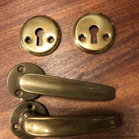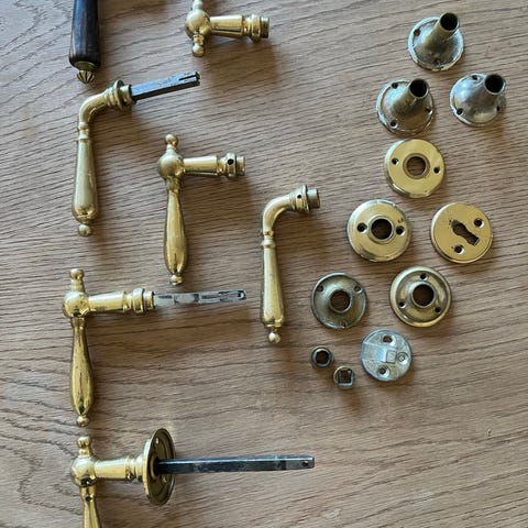 2 sæt dørhåndtag og 7 nøgleskilte i messing.