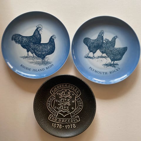 Har nogle fjerkræ platter med race høns til KUN 150kr pr stk - SPAR 50kr ved køb af dem alle - som kan afses. Serien er udgivet af Danmarks Fjerkræavler forening for Raceavl.
