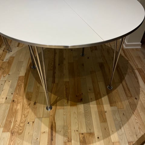 Lækkert spisebord - skal afhentes i Asserbo tæt på Liseleje. Bordet har dannet rammen om mange hyggelige middagsselskaber. Det har lidt ridser hist og pist, men kan du leve med det så får du super kvalitet til ingen penge. Der følger 2 tillægsplader med på hver 45 cm, så bordet kan blive op 3,05 meter.