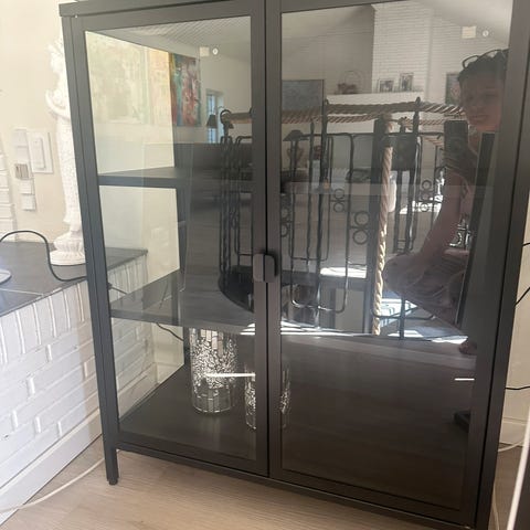 Stænk i sort stål. Tidligere skab/vitrineskab, som er lavet om til skænk (da benene blot er blevet forkortede). Skænken er i fin stand og har naturligvis lidt patina - se billeder. Kan snildt overfladebehandles med lidt sort maling, hvis det er.