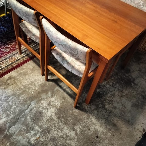 6 teaktræ stole, brugte men i god stand (stabile), ombetrukket med sort nappa i 2023)