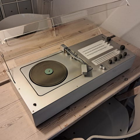 Braun Regie 520 Dieter Rams 1972. Tung (17 kg.) og kraftfuld reciever/forstærker i samlerstand. Gennemgået og repareret på værksted i 2025 og spiller kraftfuldt som den skal med god bas. Med et DIN-adapterkabel og en Bluetooth-modtager kan man gennem anlægget afspille musik direkte fra sin telefon som på et Sonos anlæg. Kan demonstreres. .