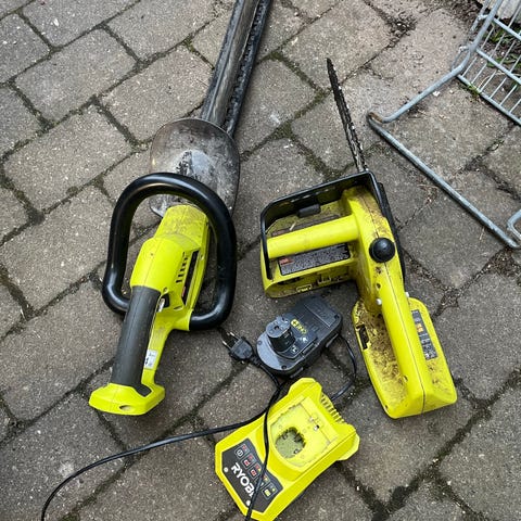 Hækklipper, græstrimmer, batteri og oplader, + to 18 volt batterier.