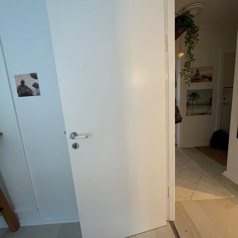Døren har en traditionel design med rektangulære paneler og en rund nøglehulskilt i metal.