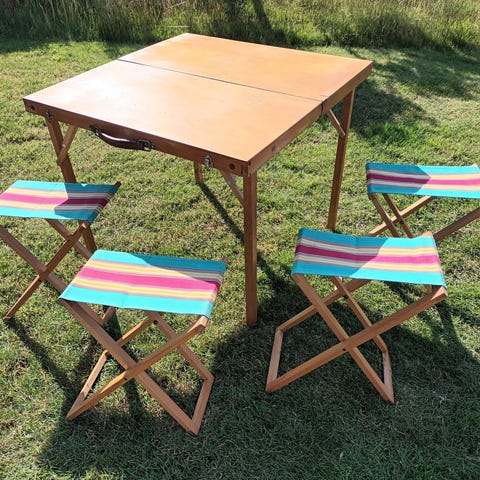 Retro campingbord inkl. 4 stole. Sammenklappelig til kuffert. God stand.