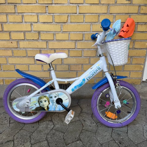 Disney Frozen børnecykel med 14 tommer hjul. Cyklen har en hvid ramme med lilla hjul og detaljer.