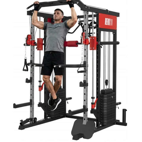 Finnlo by Hammer Multi Gym træningsmaskine med polstret sæde og rygstøtte, designet til styrketræning i hjemmet. Maskinen har flere træksystemer og håndtag til forskellige øvelser, inklusive lat pulldown, brystpres og benpres. Konstruktionen er i metal med sorte og grå farver, egnet til alsidig muskeltræning.