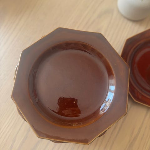 12 retro tallerkener i brunlig nuance, keramik. Er tunge. Sælges kun samlet.
