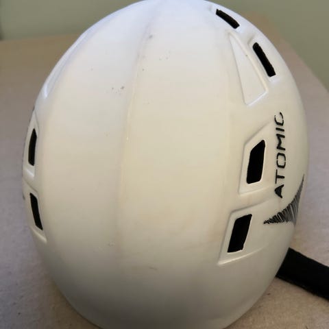 Hvid skihjelm med lyserøde blomster, knappen til at sætte brillerne fast er gået i stykker men fungerer fint og er blød og justerbar