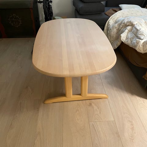 Stand nogenlunde, men kan blive rigtigt flot, hvis det bliver slebet og olieret. Massivt. Kan skilles. Afhentes Hellerup eller Holbæk egnen.