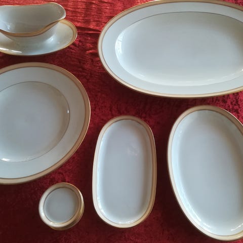 12 kopper med underkop, 12 kagetallerkener, 1 sukkerskål, 1 flødekande og et kagefad. Alt er i superfin stand og det kan knapt ses at det er brugt.