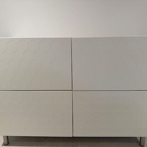 Skænk med 4 flytbare hylder, og hvis man vil skifte stil, kan man købe andre ben og låger i ikea. Afhentning hurtigst muligt, da andet møbel er købt.