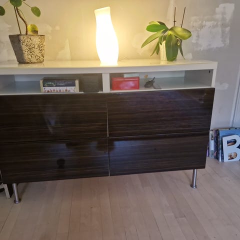 Pæn skænk med 6 flytbare glashylder, lyset medfølger også, og hvis man vil ændre stil, kan andre ben, hylder og låger købes i ikea.