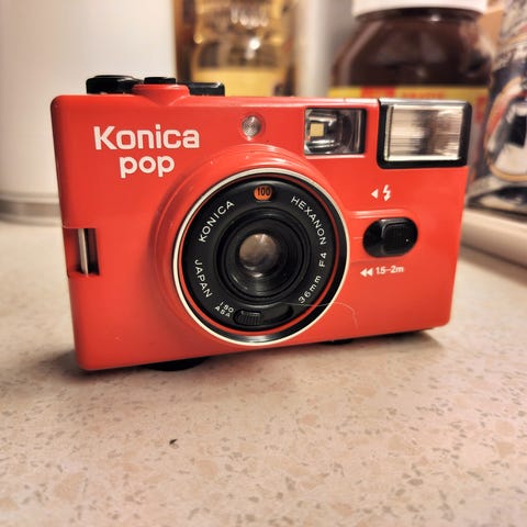 Konica Pop-AF analogt kamera med autofokusfunktion og indbygget blitz. Kameraet har en kompakt og let design, velegnet til brug med 35 mm film.