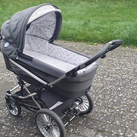 Virkelig flot barnevogn med drejehjul. Medfølger lift, regnslag og indbygget myggenet og solsejl.