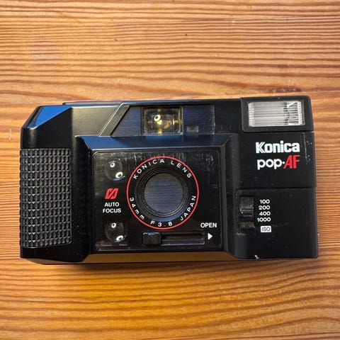 Et ikonisk Konica C35 kamera med indbygget flash og manuel filmindføring. Velegnet til analog fotografering med 35mm film.