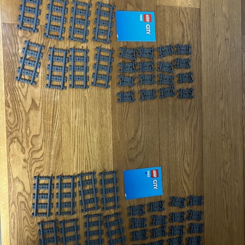 LEGO City Togbane sæt med forskellige togrelaterede dele inklusive skinner, vogne og tilbehør. Indeholder flere farvede plastikdele og en vejledning. Velegnet til samling og leg inden for LEGO City temaet.