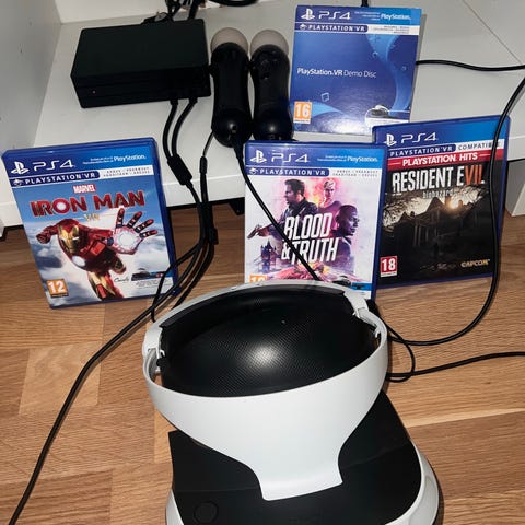 Sony PlayStation VR virtual reality headset med to PlayStation Move controllere og PlayStation kamera. Sættet inkluderer VR-headset, bevægelseskontrollere og nødvendige kabler. Velegnet til brug med PlayStation konsoller. Incl adapter stik til PS5.