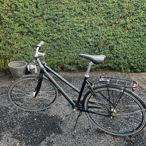 Kildemoes Neksø damecykel. Cyklen har en turkis farve og er udstyret med front- og bagkurv for ekstra opbevaringsmuligheder. Den har en klassisk rammeform med lav indstigning, hvilket gør den nem at komme af og på. Cyklen er velegnet til daglig transport og bykørsel.