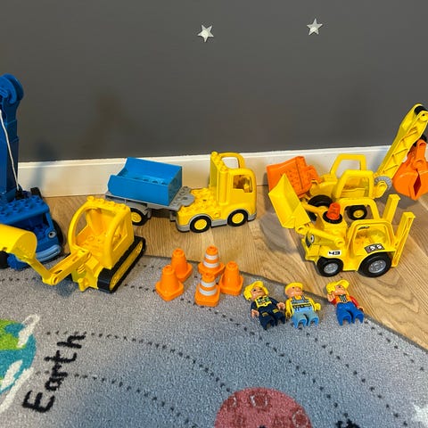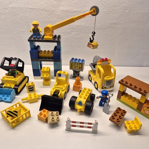 LEGO DUPLO store byggeplads maskiner med flere forskellige køretøjer i gule farver. Sættet inkluderer en stor gravemaskine med larvefødder og andet