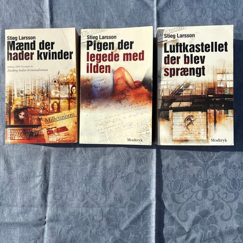 Stieg Larsson Millennium serie bestående af bøgerne 'Mænd der hader kvinder', 'Pigen der legede med ilden' og 'Luftkastellet der blev sprængt'. Bøgerne er på dansk og tilhører krimi- og thriller-genren.