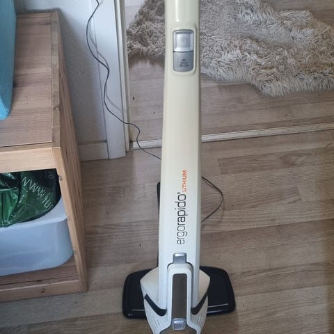 Electrolux Ergorapido Plus støvsuger i rød farve. Ledningsfri design med genopladeligt batteri. Velegnet til hurtig rengøring af gulve og tæpper. Kompakt og let at håndtere.