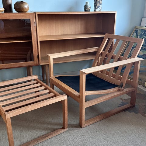 Børge Mogensen slædestol i massiv lakeret egetræ. Polster i tykt groftvævet uld er intakt