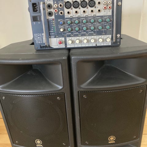 Yamaha aktive højttalere sæt med indbygget mixer. Sættet inkluderer to højttalere med flere inputmuligheder og kontrolpanel på bagsiden. Højttalerne er velegnede til live lyd, events og lydforstærkning. Materiale og farve er sort. Det er Stagepas 600 i