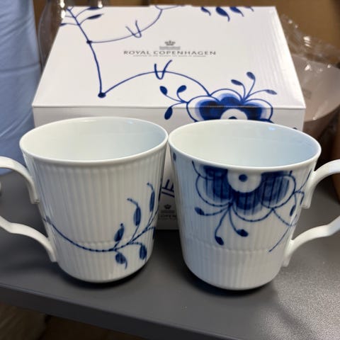 Blue fluted mega cup, 36 cl 2-pak: 450 kr. per sæt af to kopper (har to sæt, dvs. 4 kopper)
