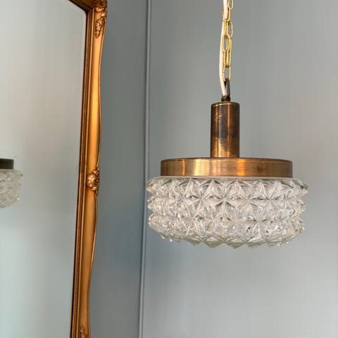 Fin gammel entre-lampe, vintage, messing og slebet glas.