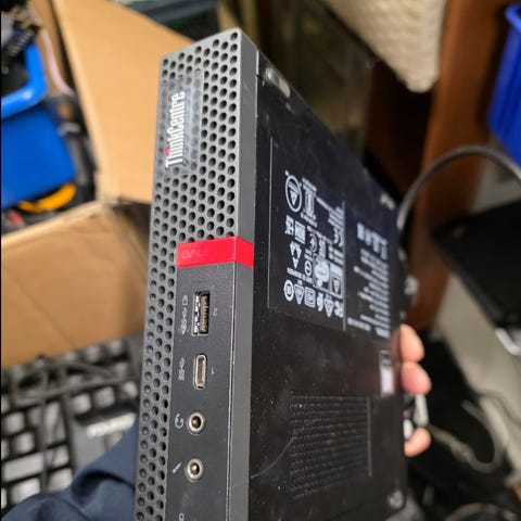Lenovo ThinkCentre M75q-1 Tiny stationær computer. Produktet er i emballage med etiketter, der viser modelnavn og serienummer. Specifikationer som størrelse og farve er ikke angivet på etikettene.