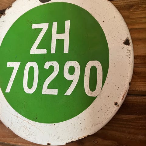Traktornummerplade med nummer 46 0012, grøn baggrund med hvide tal. Metal 12x16 cm