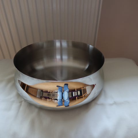 Højglanspoleret brødskål i rustfrit stål. 24 cm i diameter. Næsten som ny. To stofposer medfølger. Sort og hvid.