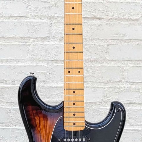Guitaren er nyopset og sat i stand og fremstår i rigtig flot stand med kun meget få og små brugsspor. Spiller let, lav strengehøjde og stemmer stabilt – også ved brug af tremolo.