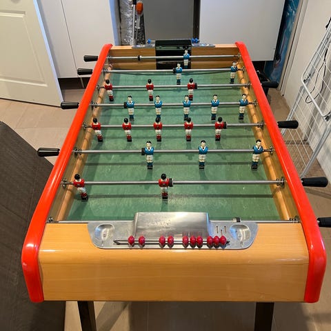 Roberto bordfodboldspil med blå og røde spillere. Spillet har en grøn spilleflade og sorte og gule kanter. Udstyret med metalstænger og håndtag til spilkontrol. Egnet til indendørs brug for børn.