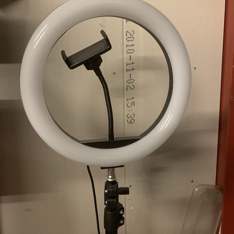 Selfie Ring Light med en diameter på 26 cm, inkluderer stativ og telefonholder. Designet til at give ensartet belysning ved fotografering eller videooptagelse. Kan justeres via en kontrol på ledningen.