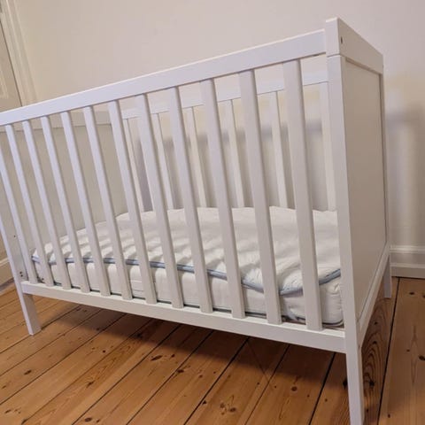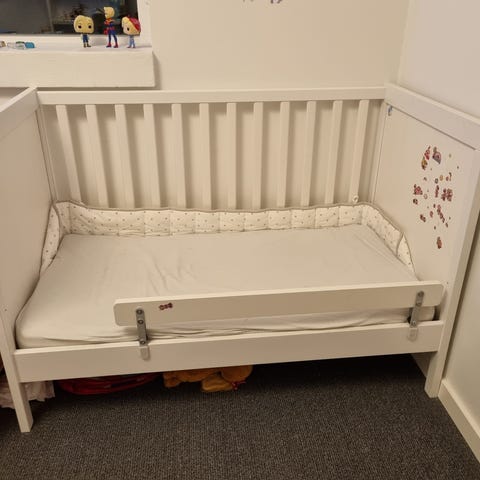 Sundvik tremmeseng fra Ikea, der kan justeres højden, samt hvor siden kan tages af, når barnet er større. Seng er meget velholdt.