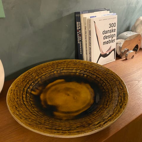 RETRO KERAMIKFAD FRA LØVMOSE KERAMIK. ORANGE OG BRUNT. Ø: 22 CM.