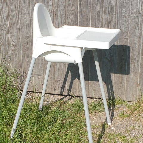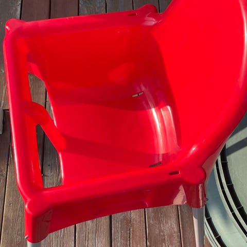 IKEA børne højstol med to forskellige mønstre, rød med hvide motiver og blå med hvide prikker. Betræk materiale og størrelse er ikke specificeret. Designet til opbevaring af børnemøbler eller lignende.