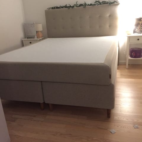 IKEA Espevär kontinentalseng, bestående af base med ben, boxmadras (hårdhed: fast) og Tistedal topmadras. Ca 5 år gammel og i meget fin stand. Nypris ca. 8800,-
