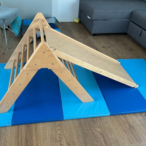 Produktet består af en kombineret trappe og rutsjebane, designet til børn med naturligt træmateriale. Kan bruges til leg og motorisk udvikling i hjemmet.