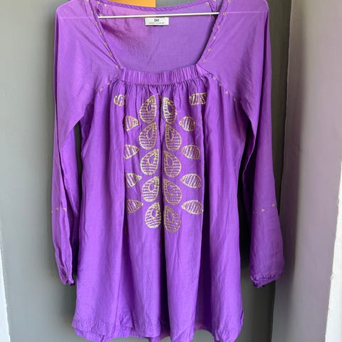 DAY Birger et Mikkelsen tunika/bluse i størrelse 34, farven pink og lavet af silke. Blusen har en løs pasform med 3/4 ærmelængde og en V-udskæring. Jeg (sidste foto) er normalt en str 38, 40, så det kommer lidt an på, hvor løst man vil have den. (+ 50kr i fragt, hvis den skal sendes).